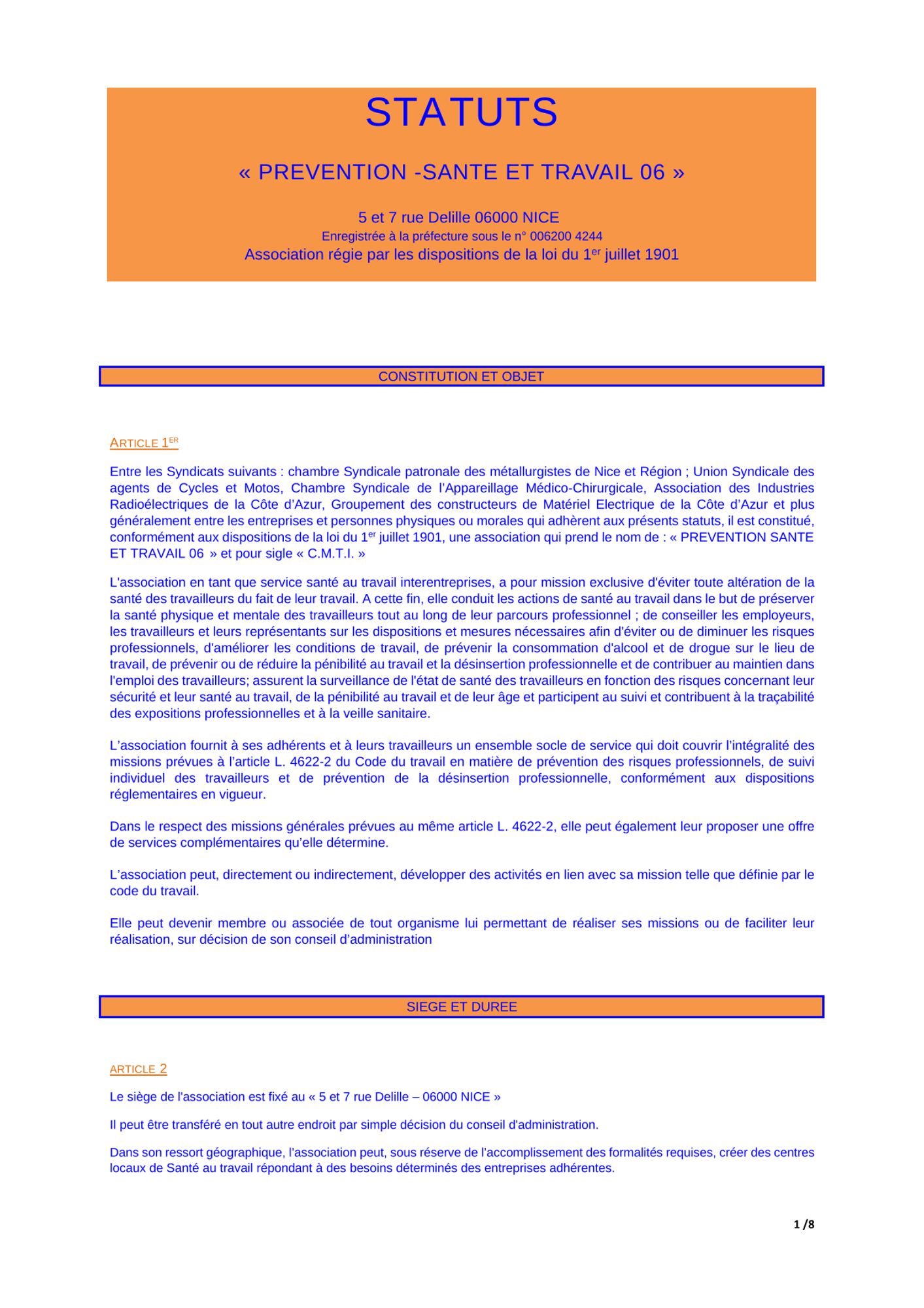Statuts Prévention Santé et Travail 06 Veuillez trouver ci-dessous le fichier des statuts du CMTI en version PDF téléchargeable. STATUTS APPROUVES 30 03 2022 (84.4 Ko)