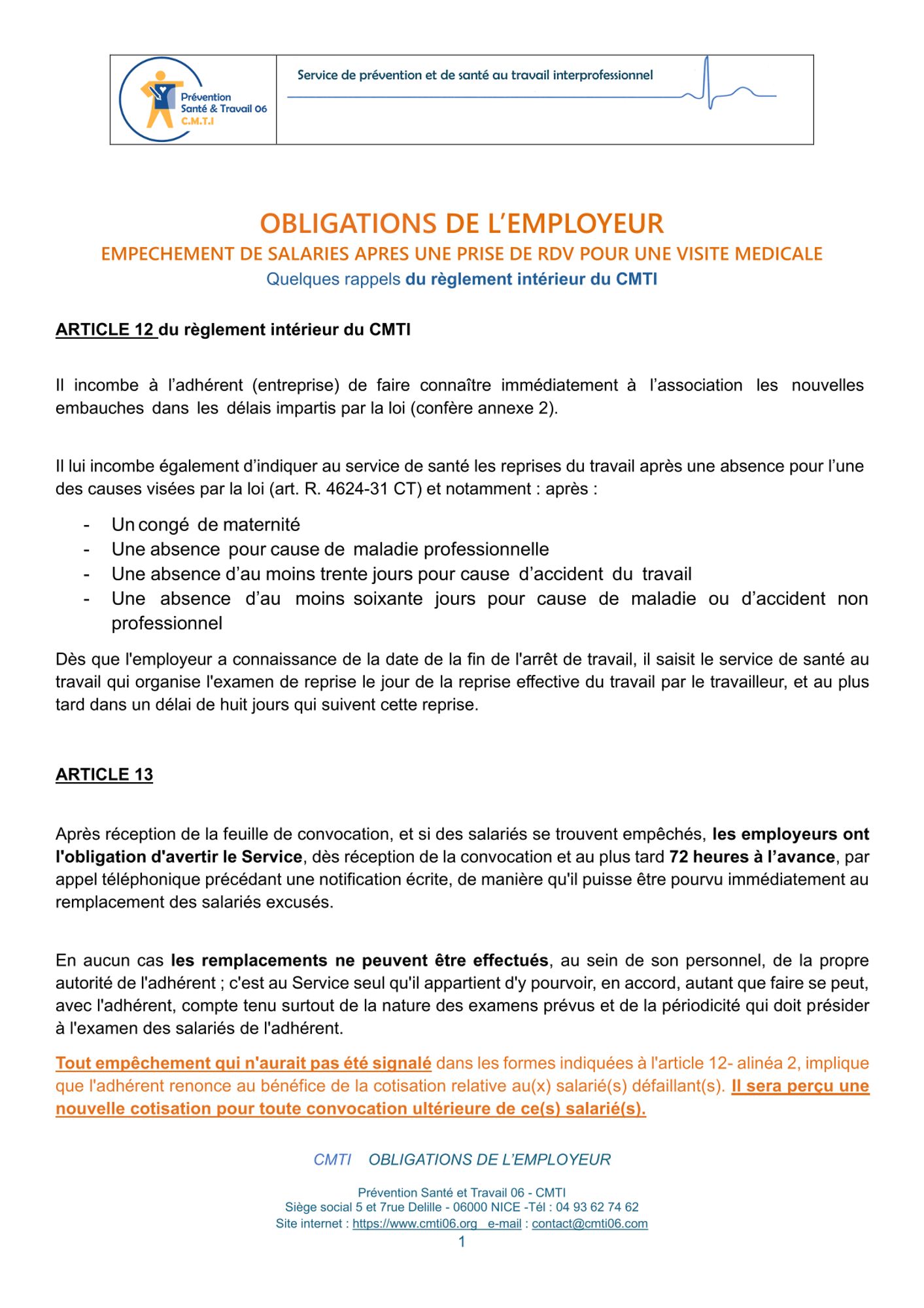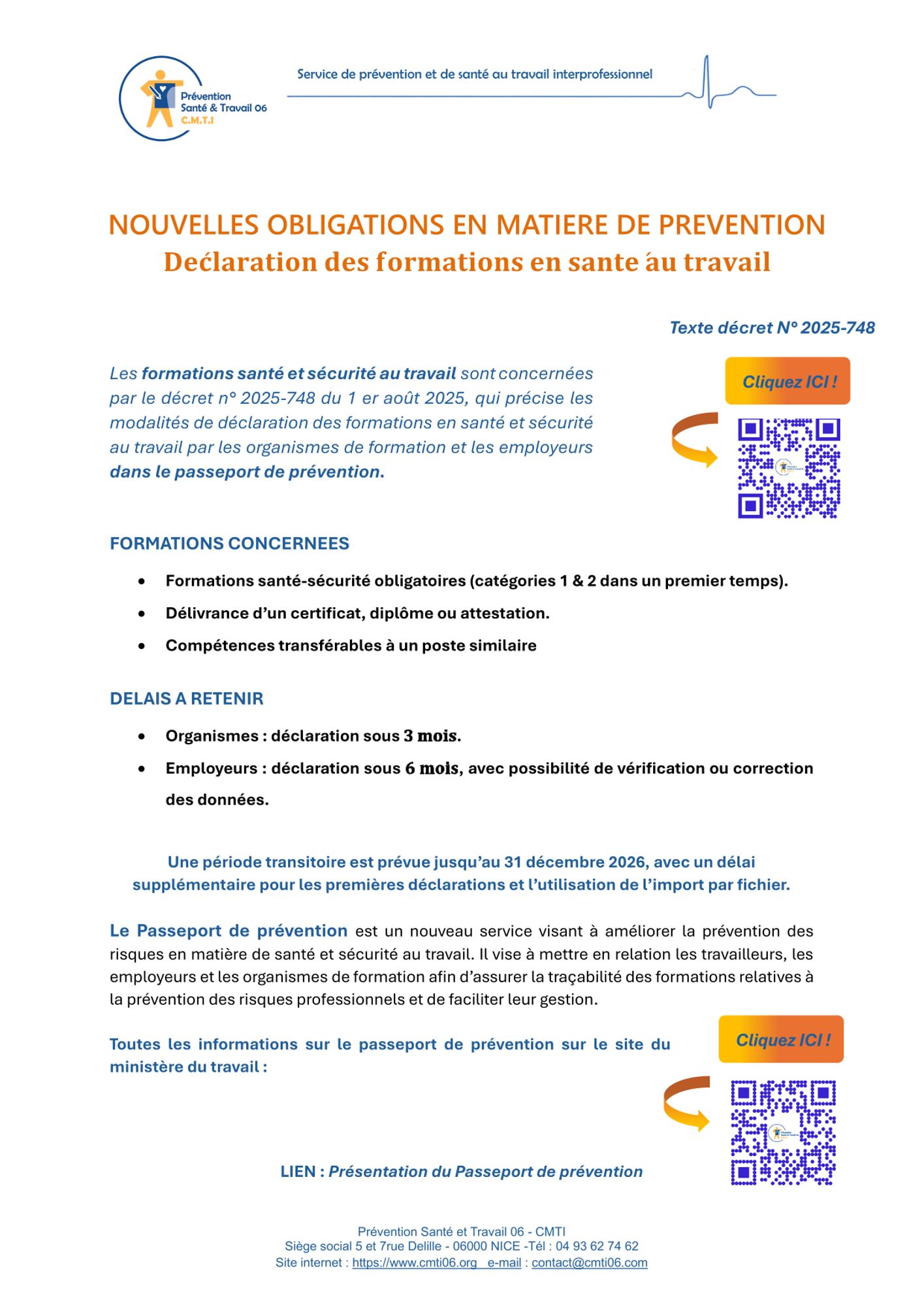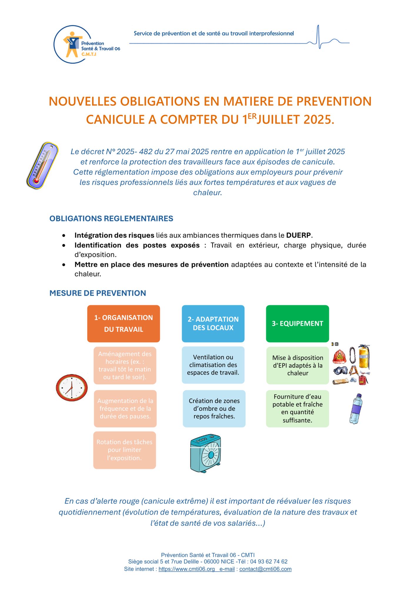 Information-réglementation-décret Décret relatif à la protection des travailleurs contre les risques liés à la chaleur (310.5 Ko) Obligations de l'employeur en cas d'empêchement du salarié, une fois la prise de rendez-vous de la visite médicale réalisée (170.6 Ko) Décret sur les déclarations des formations en santé au travail et sur le passeport prévention (467.6 Ko)